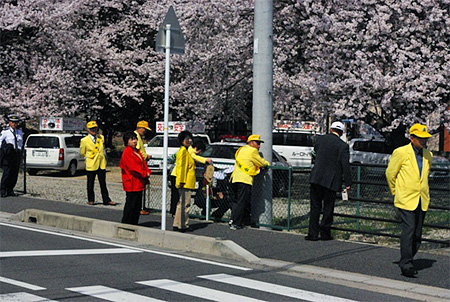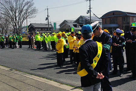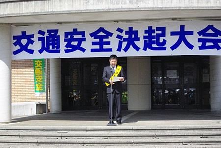 4月5日 交通安全運動初日には、日野町役場にて『春の全国交通安全運動決起大会』を行いました。この式典では、各種団体 管内市・町関係者の方々と共に交通安全への決意表明によって、交通安全への意識を再確認しその後日野町役場周辺を交通安全広報車を使って交通安全パレードをおこないました。