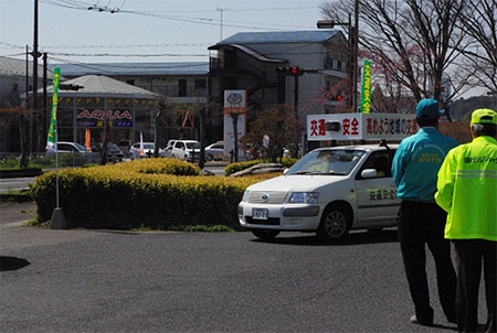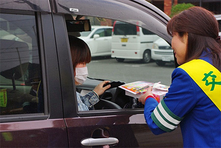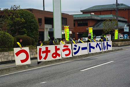 4月12日 能登川支所前の道路にて、通行車両にシートベルトとチャイルドシートの正しい着用の呼びかけをおこないました。