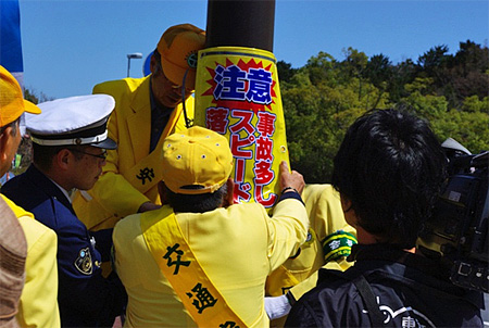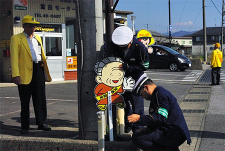 また、同日午後からは交通安全協会各支部長と役員で東近江署管内の死亡事故現場に反射タスキをかけた飛び出し人形を設置いたしました。この飛び出し人形が死亡事故抑止に役立ってくれることを期待しています。