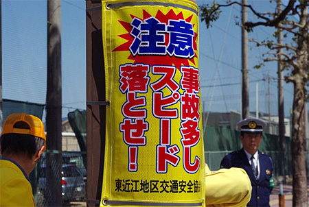 同日、午後より東近江署から八日市東浜交差点までの危険個所に 交通安全横断幕の設置を行いました。当協会役員が警察官同行のもと危険個所を確認しながら設置していきました。