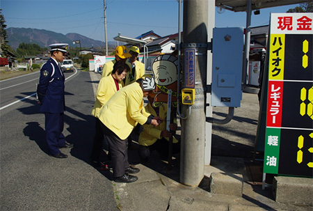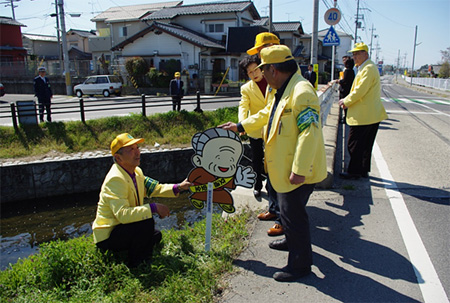 4月14日(月)午後からは交通安全協会各支部長と役員で東近江署管内の歩行者・自転車が被害に遭った事故現場または、通学路に全面反射の飛び出し人形を設置いたしました。この飛び出し人形が交通事故抑止に役立ってくれることを期待しています。
