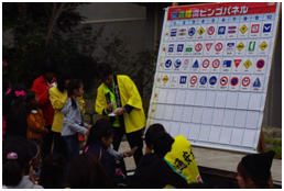 また、交通安全協会のブースでは、子供たちを対象に交通安全ビンゴゲームを行いました。ビンゴゲームのパネルに標識を用いまして、日頃なんとなく見ている標識について知って頂くゲームです。今年で、3回目となりますがたくさんの子どもたちが参加して下さいました。また、保護者の方たちも一緒にご覧いただき、あまり見慣れない標識があるのにおどろいておられました。