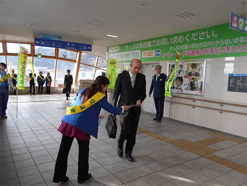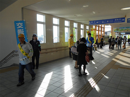 4月6日(水)朝には交通安全運動のスタートの日なので、PRをこめてJR能登川駅構内において乗降客にのぼり旗・啓発品を用いて交通安全の呼びかけをおこないました。