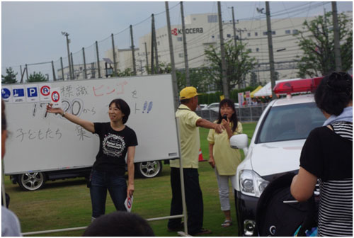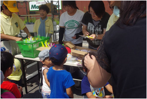 子ども達を対象に行いましたが、保護者の方々にも好評で皆さん楽しんでおられました。ゲームの終わった子どもたちには、ディズニ―キャラクターのリストバンドをお渡しして、『交通事故にあわないように気を付けて、楽しい夏休みをすごしてね』と声掛けをしました。