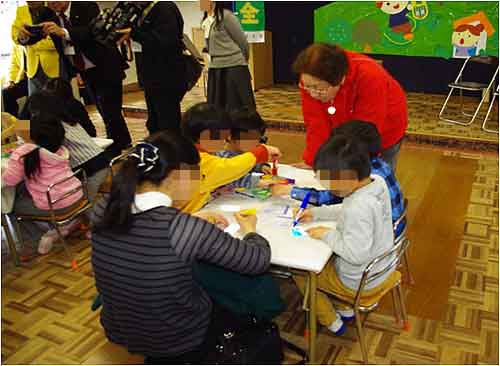 「新入学(園)児と高齢者の交通事故防止運動」初日の3月15日に東近江市内のみつくり保育園にて約70人が参加し、4月から小学校に通う子ども達とその祖父母らが、お互いの交通安全を願ってお守りを作る「孫と祖父母の交通安全お守り大作戦」を実施しました。子ども達は祖父母のために祖父母らは孫のために、それぞれ反射素材のお守りに油性のフェルトペンで似顔絵や花、動物など思い思いのイラストを描きました。完成したお守りは太郎坊宮で交通安全祈願を受けました。