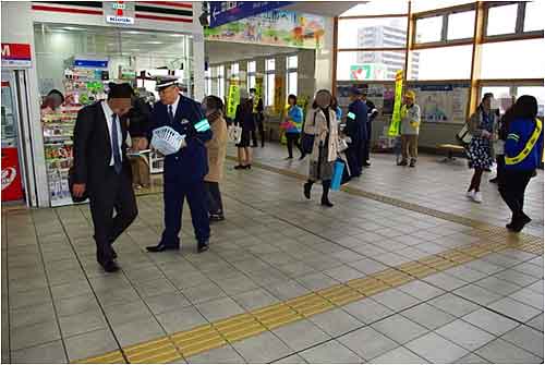 春の全国交通安全運動のスタートに伴いJR能登川駅の改札前で、駅ご利用の方々に交通安全の呼びかけをして、安全運動のチラシと啓発品をくばりました。