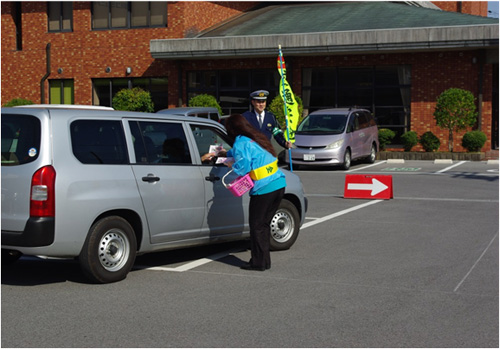 東近江市役所能登川支所前にて能登川交通安全会の皆さんと一緒に、『チャイルドシート・シートベルト着用街頭啓発』実施しました。ドライバーの皆さんへ、シートベルト着用の看板を掲げて、呼び掛けや啓発品を手渡して声掛けを行いました。