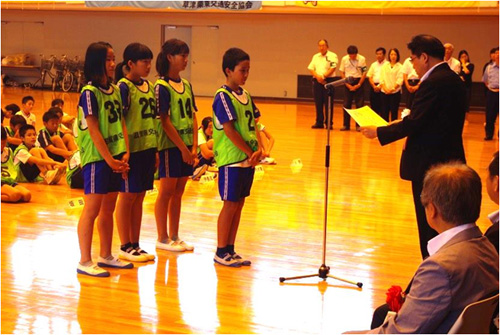 大津の県立体育館で、『交通安全子供自転車滋賀県大会』が開催されました。 東近江地区からは、先日東近江地区大会に見事優勝した、愛荘町立秦荘西小学校のチームが参加してくれました。 各地区代表チームそれぞれ、日頃の練習成果を存分に発揮しレベルの高い競技となりました。 結果は、団体で3位の成績を納め、個人では野々村花凛さんが敢闘賞に入賞しました。