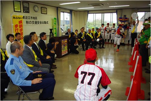 東近江地区交通安全推進会議の各種団体の方々多数参加のもと『秋の全国交通安全運動』の決起大会を行いました。今回は『東近江バイオレッツ』の方による大会宣言・パフォーマンスを行い、安全運動の始まりと交通安全気運の向上に努めました。