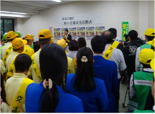令和元年9月21日(土)東近江市役所東庁舎東A会議室にて、秋の交通安全初日に出動式を行いました。あいにくの雨の為会議室での開催となりましたが各地区のハイスクール・セイフティ・リーダーによる交通安全メッセージ伝達式など関係機関の皆様、団体の方々が参加して頂き秋の全国交通安全運動の気運を向上して頂きました。