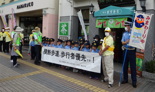 八日市駅より「横断歩道は歩行者優先です」 の横断幕を持って、東近江警察署までジュニアポリスに扮した、こども園あっぷるの園児さんがあっぷるレンジャーとして行進し交通安全の啓発をして頂きました。