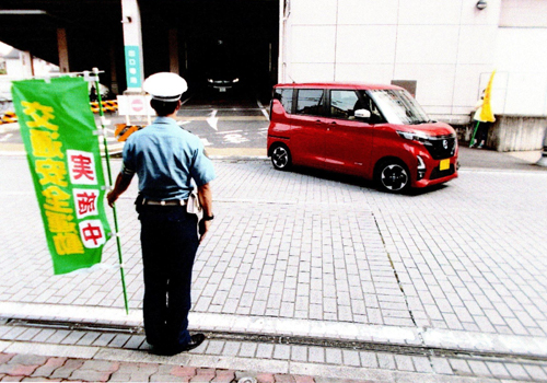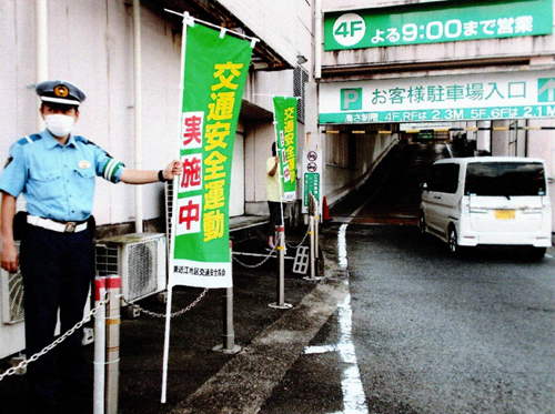 アピア東近江店立体駐車場出入り口にて、のぼり旗を持って安全運転の立番啓発を行いました。