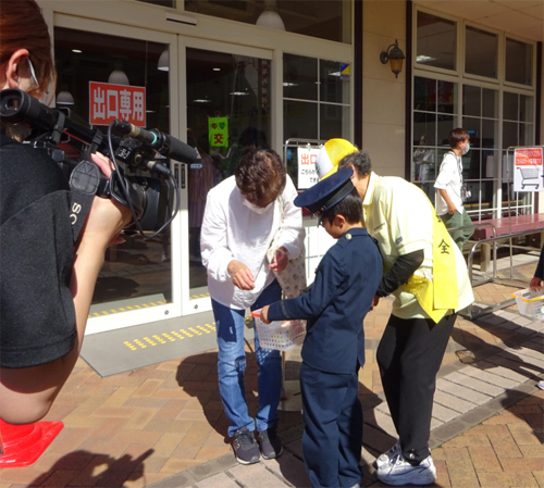 緊急事態宣言の発令が解除されたことで、外でお酒を飲む機会が増える可能性があることから、ジュニアポリスに扮した子供達が買い物客に飲酒運転禁止を呼びかける交通安全啓発を行いました。(場所:愛東マーガレットステイション直売所前)