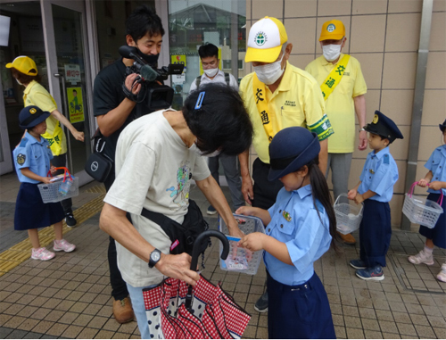 令和4年7月4日(月)近江鉄道八日市駅にて八日市めぐみ保育園の園児がジュニアポリスに扮して、近江鉄道八日市駅ギャラリーに交通安全の願い札を取り付け、駅利用者に反射材を配布しました。