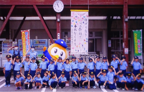 令和4年7月15日(金) 道の駅永源寺渓流の里にて、永源寺もみじ幼児園の園児がジュニアポリスに扮して、来場者に反射材を配布しました。