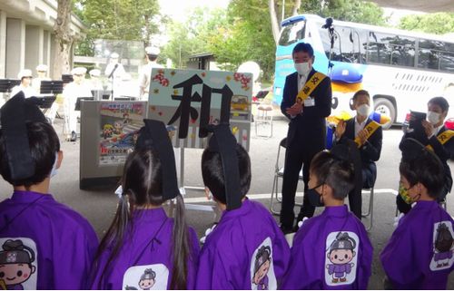令和4年9月21日(水)東近江市役所本館正面玄関において、東近江地区交通安全推進会議の各種団体の参加のもと『秋の全国交通安全運動』の決起大会を行いました。聖徳太子に扮した建部幼稚園児が『和をもって貴し(たつとし)となす』という言葉にちなみ、人々がお互いに仲良く調和していくことが最も大事なことであるという思いを表すことで『和』の漢字を一画ずつパネルに貼りました。その後大会宣言、滋賀県警音楽隊による演奏、広報車によるパレードを行い、『秋の全国交通安全運動』の気運を向上して頂きました。