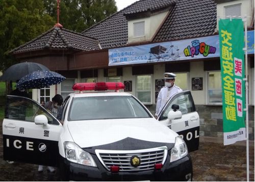 令和4年9月23日(祝)滋賀農業公園ブルーメの丘において、パトカー、白バイの展示、ブルーメの丘に来られた方に、『事故防止シール』を貼ったオリジナルウェットティッシュを配らせて頂きました。