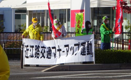 令和4年10月25日(火)フレスコ能登川店前、ドコモショップ能登川店前にて、交通事故件数と死者数を減少させる為、早め点灯、全座席シートベルトチャイルドシートの着用を呼びかけるのぼり旗やプレートを掲げ啓発を実施しました。