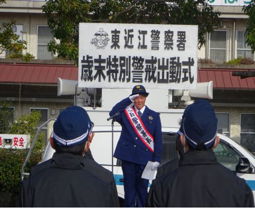 令和4年11月27日(日) 東近江市役所 東庁舎北側駐車場にて、東近江バイオレッツの中嶋優菜さんを一日警察署長として迎え、激励の言葉・服装点検・商工戦隊赤レンジャイさんによるパフォーマンス・広報車20数台のパレード・滋賀学園中学、高等学校の吹奏楽部の演奏が式典を華やかにして頂きました。