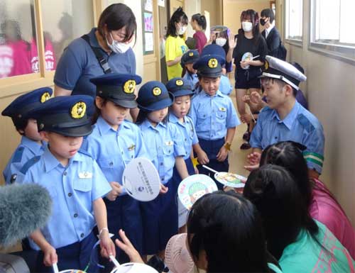 能登川高校文化祭にてそらの鳥こども園の5歳児さんがジュニアポリスに扮し、啓発品を配布し、ヘルメット着用を呼びかけました。
